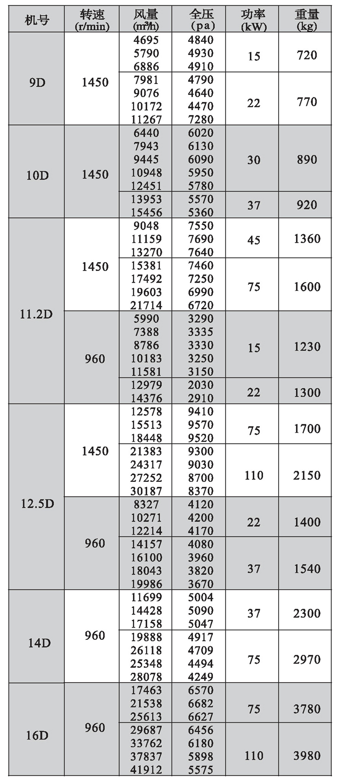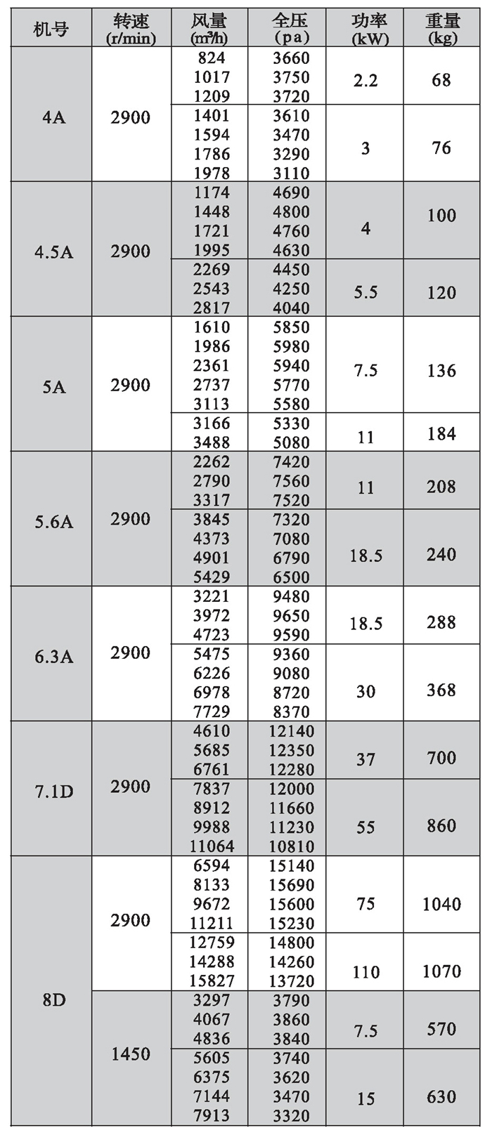 9-19離心風機性能參數表