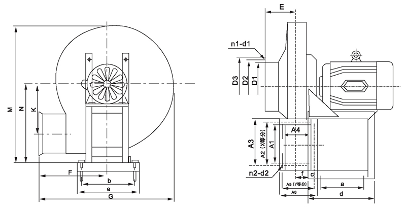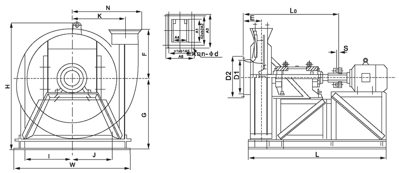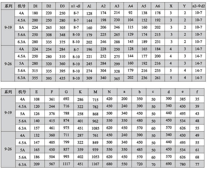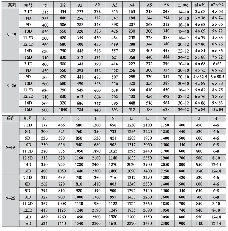 9-19、9-26系列7.1D~16D離心風機外形尺寸圖、表